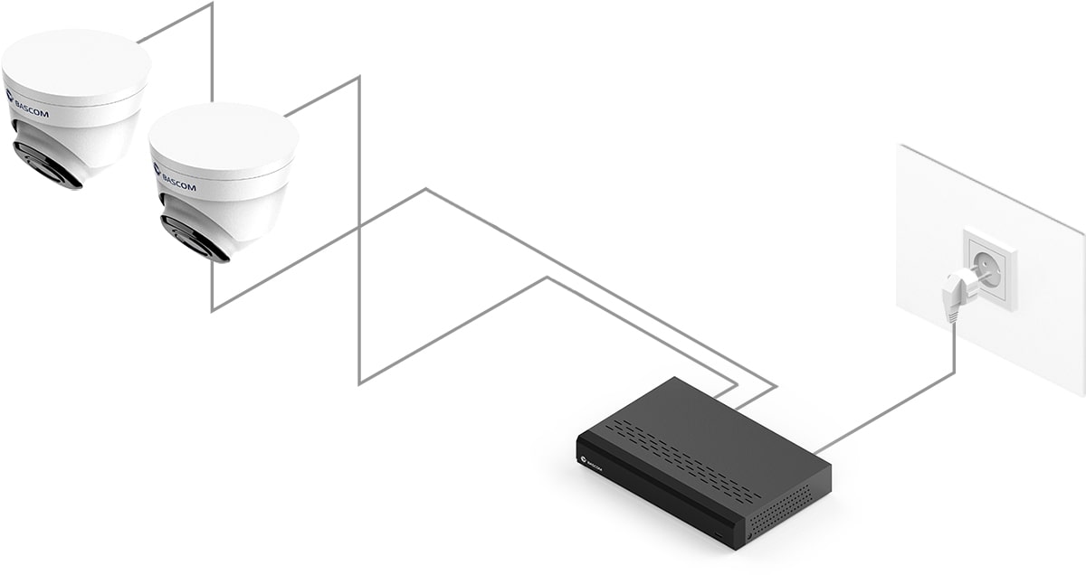 Entdecken Sie den Komfort von Power over Ethernet (PoE), einer innovativen Technologie, die es ermöglicht, jede Kamera mit nur einem einzigen Kabel anzuschließen. Die Kamera sendet die Bilder über dieses Kabel an den Rekorder, während der Rekorder die Kamera mit Strom versorgt. Ein separater Stromanschluss der Kamera ist nicht mehr erforderlich.