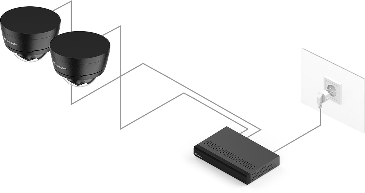 Entdecken Sie den Komfort von Power over Ethernet (PoE), einer innovativen Technologie, die es ermöglicht, jede Kamera mit nur einem einzigen Kabel anzuschließen. Die Kamera sendet die Bilder über dieses Kabel an den Rekorder, während der Rekorder die Kamera mit Strom versorgt. Ein separater Stromanschluss der Kamera ist nicht mehr erforderlich.