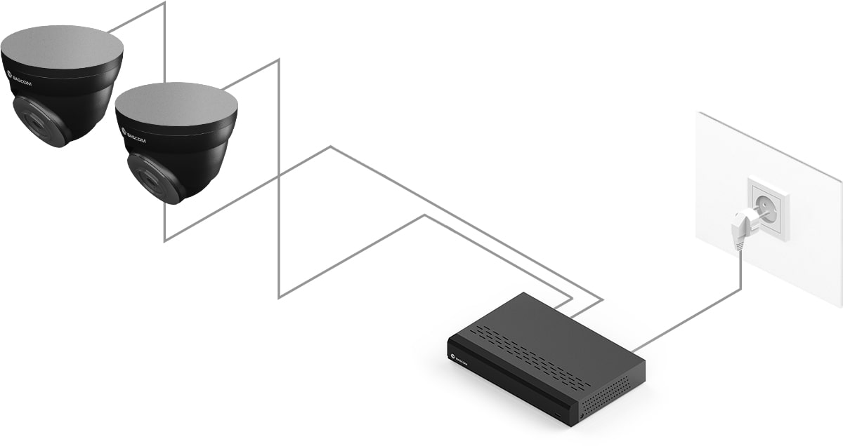 Entdecken Sie den Komfort von Power over Ethernet (PoE), einer innovativen Technologie, die es ermöglicht, jede Kamera mit nur einem einzigen Kabel anzuschließen. Die Kamera sendet die Bilder über dieses Kabel an den Rekorder, während der Rekorder die Kamera mit Strom versorgt. Ein separater Stromanschluss der Kamera ist nicht mehr erforderlich.
